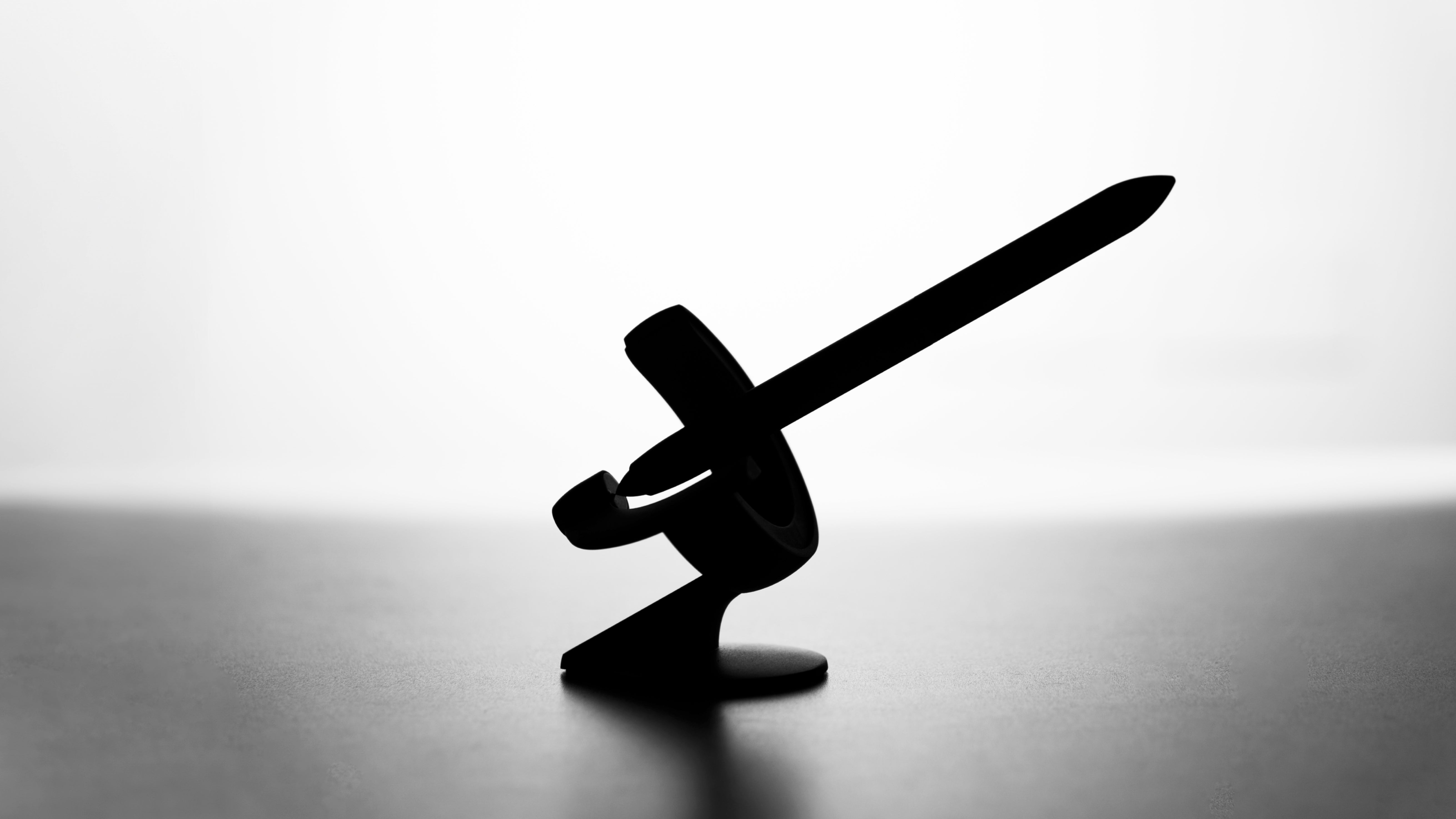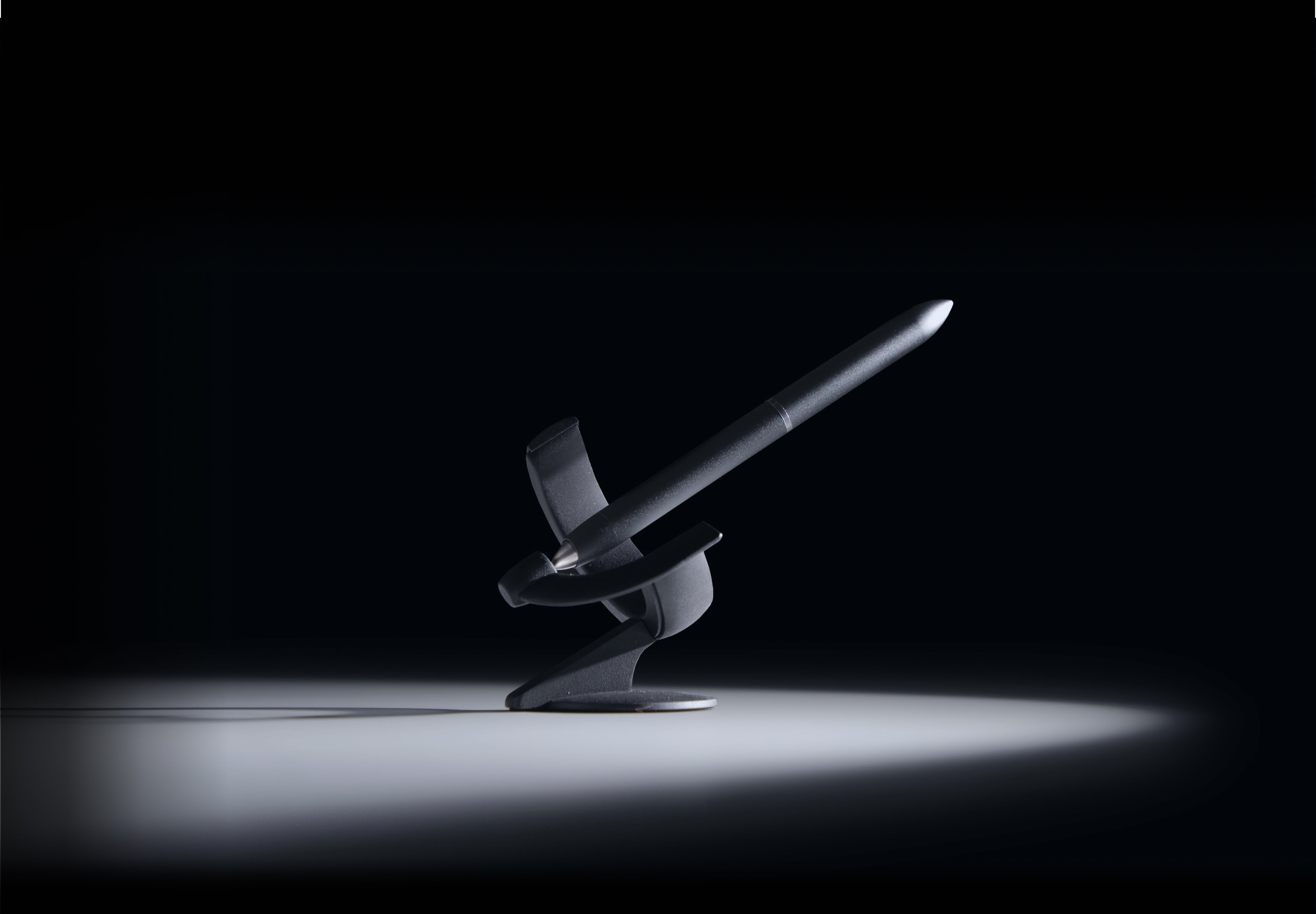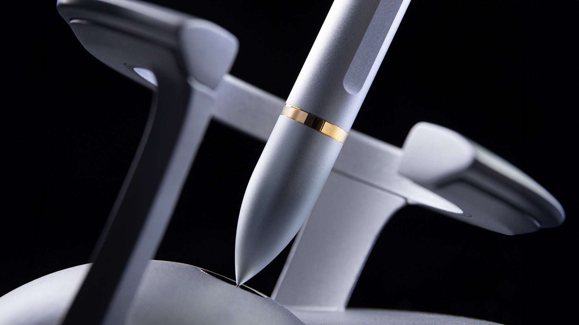 Ogni curva e angolo di questa futuristica penna stilografica e della relativa base sono stati studiati con precisione, creando un'opera d'arte funzionale che trasforma il vostro spazio.