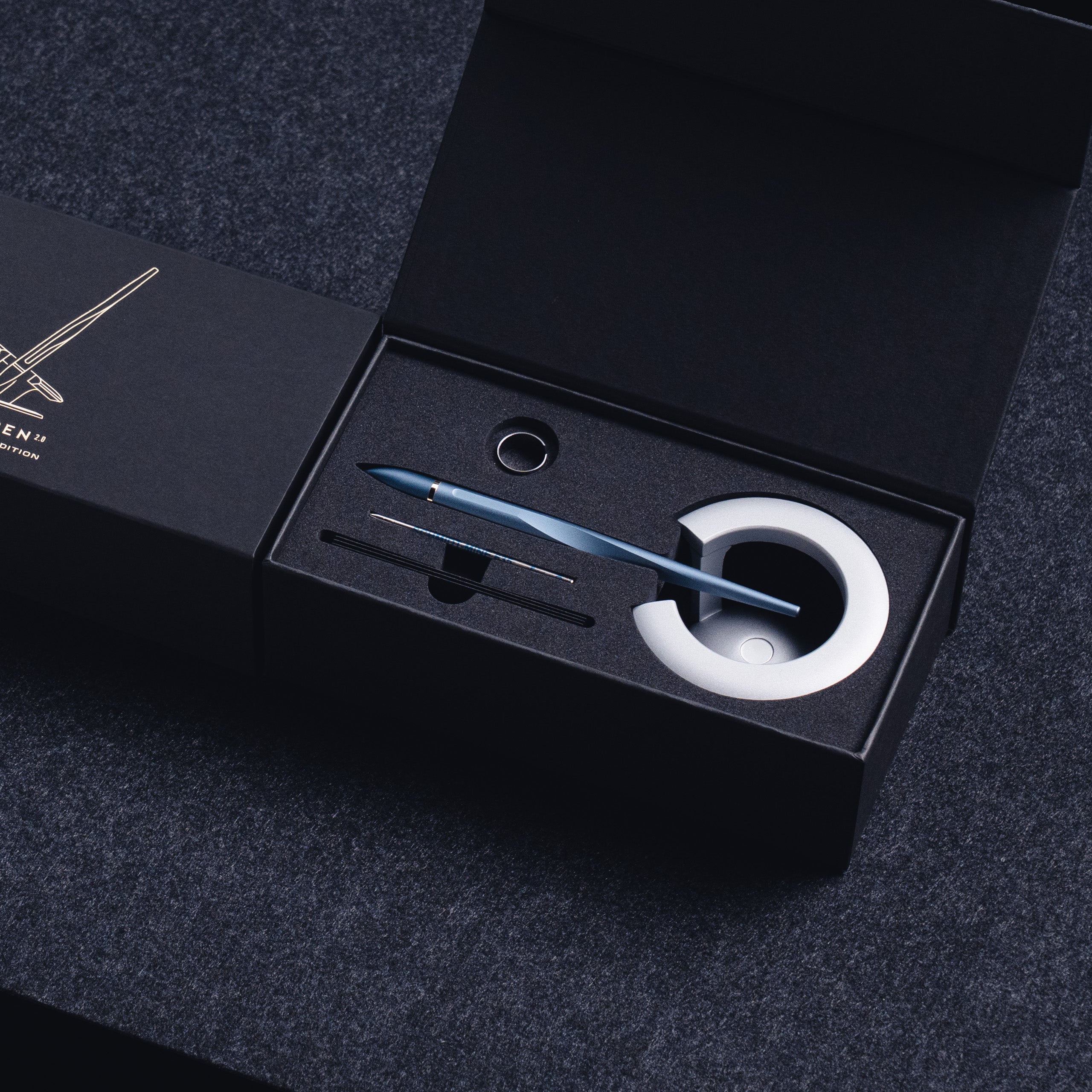 Penna di grado aerospaziale che fluttua a 23,5°, unendo design cosmico con lavorazione di precisione.