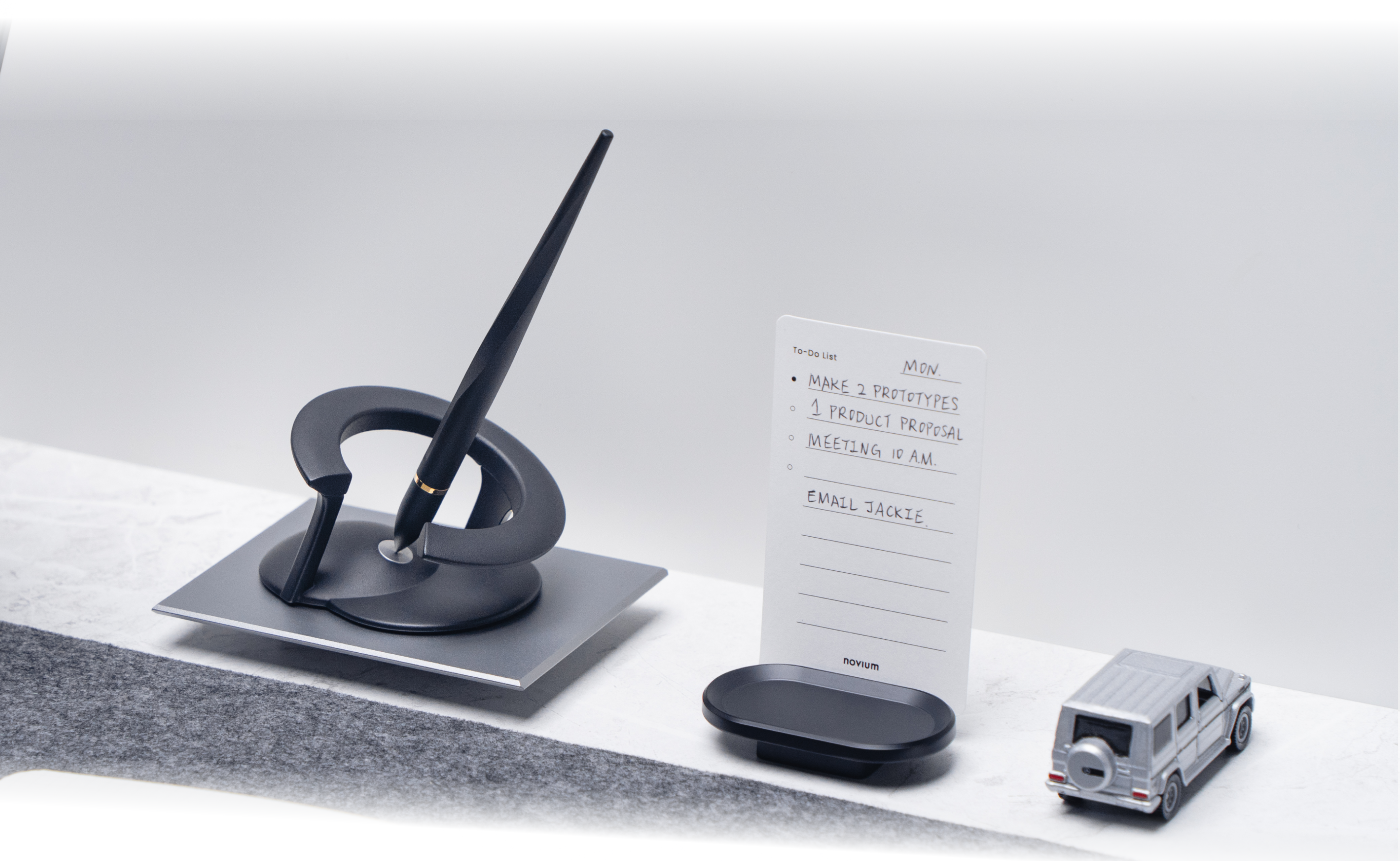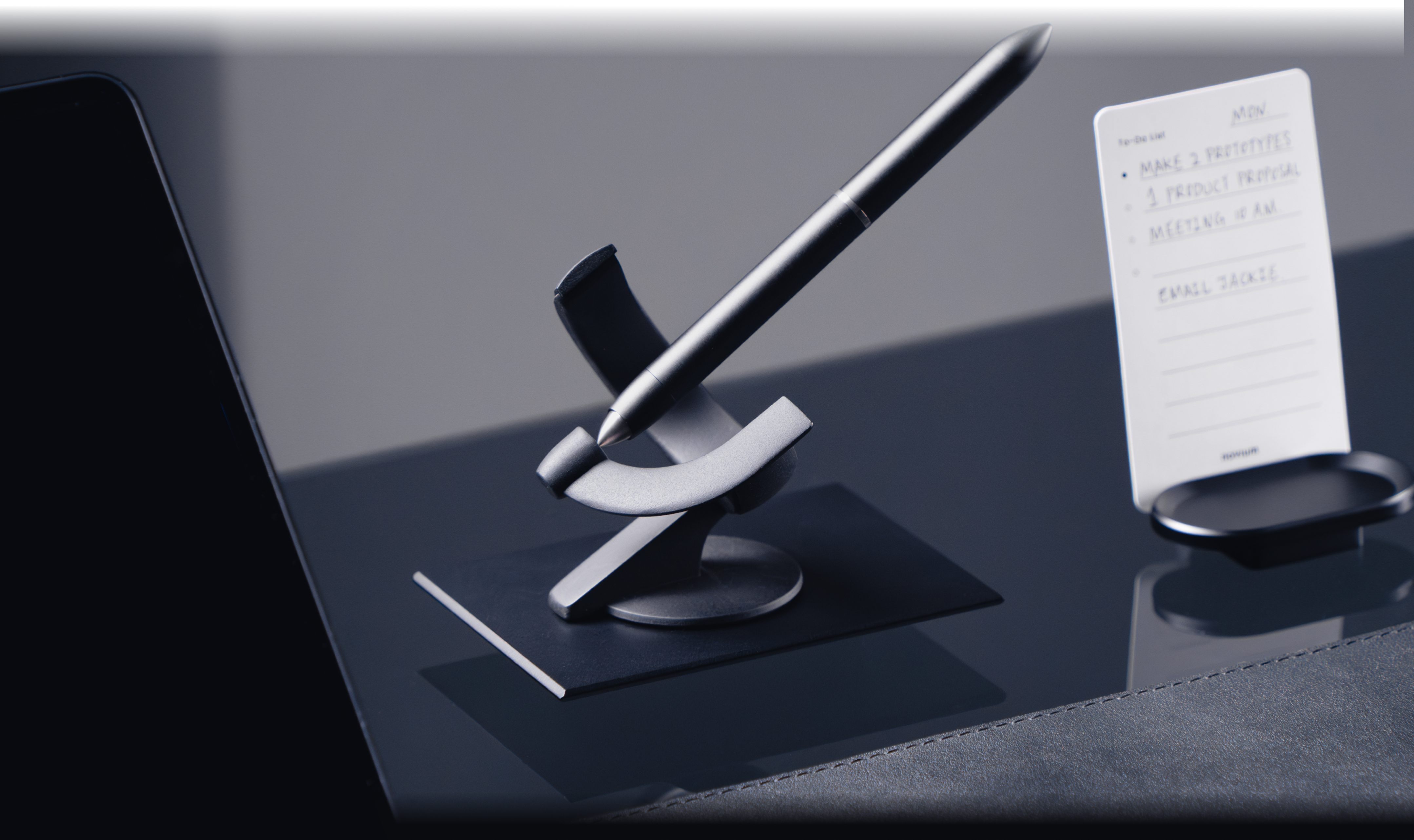 Evocando un senso di spazio esterno a livello degli occhi, questo geniale supporto in alluminio valorizza la Hoverpen e gli accessori da scrivania.
